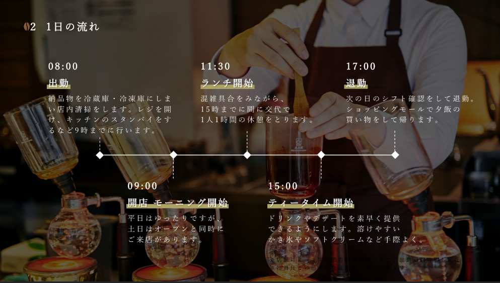 まず、企業の雰囲気や社員の実際の1日のスケジュールなど、「求職者が求めている情報ではあるけれど、求人原稿に書くと文字数が増えすぎてしまう項目」を考える。そういった項目を、写真やイラストを活用してより視覚的に、より興味深く伝えられる採用ピッチ資料を制作する。