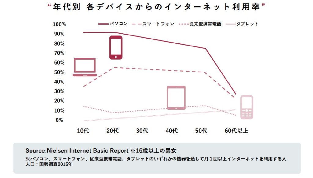 40代以下では80%以上、50代でも70%以上がインターネット利用にスマートフォンを使用し、60代でもスマートフォンの利用率は55%と、5%ほどPCを上回っています。