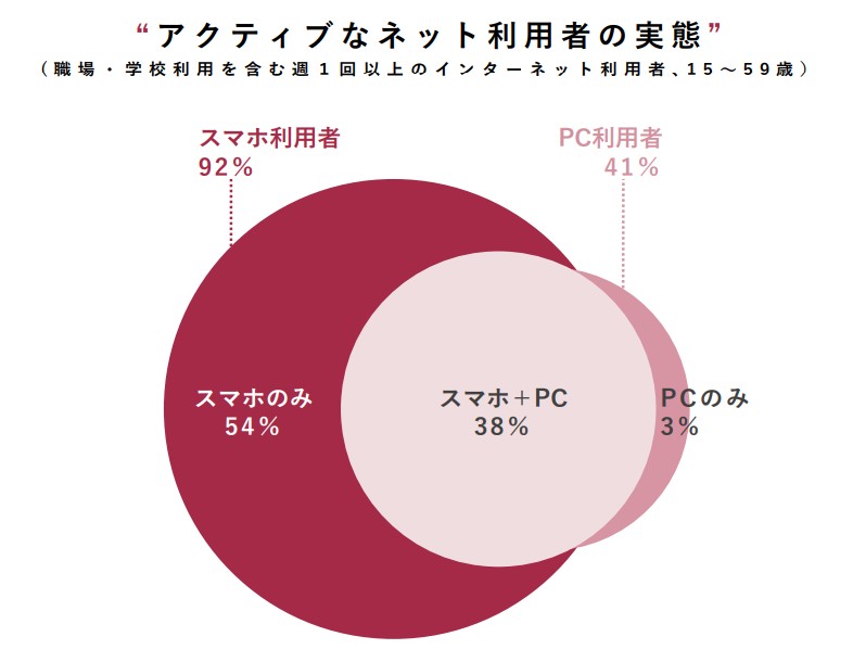 またインターネット利用者全体のうち、インターネット利用の際に使用するデバイスが「スマートフォンのみ」のユーザーが54%であるのに対して、「PCのみ」のユーザーは3%しかいないという調査結果もあります。(※2)