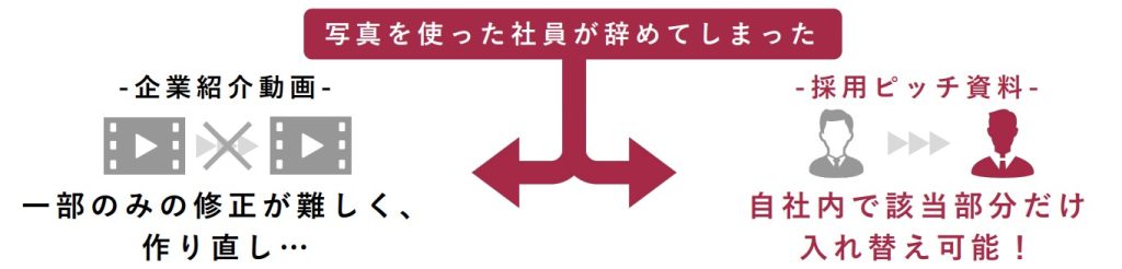 動画やサイトは、例えば「映っている社員が退職してしまった」「掲載している雇用に関する情報が変更された」というような場合、1から再撮影したり、コーディングのスキルを持つ人間が調整する必要があります。そのため、納品された後に何かがあっても、対応や反映が遅くなってしまったり、大きな費用が発生するケースがほとんどです。